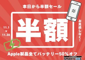このたび、日頃のご愛顧に感謝の気持ちを込めて、**11月1日~11月30日まで限定で「apple製品 バッテリー交換半額キャンペーン」**を実施いたします!