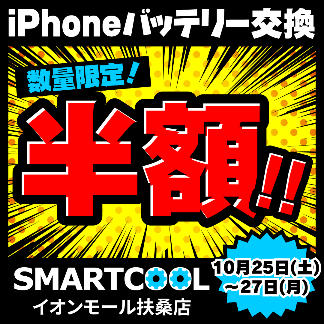 このたび、日頃のご愛顧に感謝の気持ちを込めて、**10月25日(土)〜27日(月)の3日間限定で「iPhoneバッテリー交換半額キャンペーン」**を実施いたします!